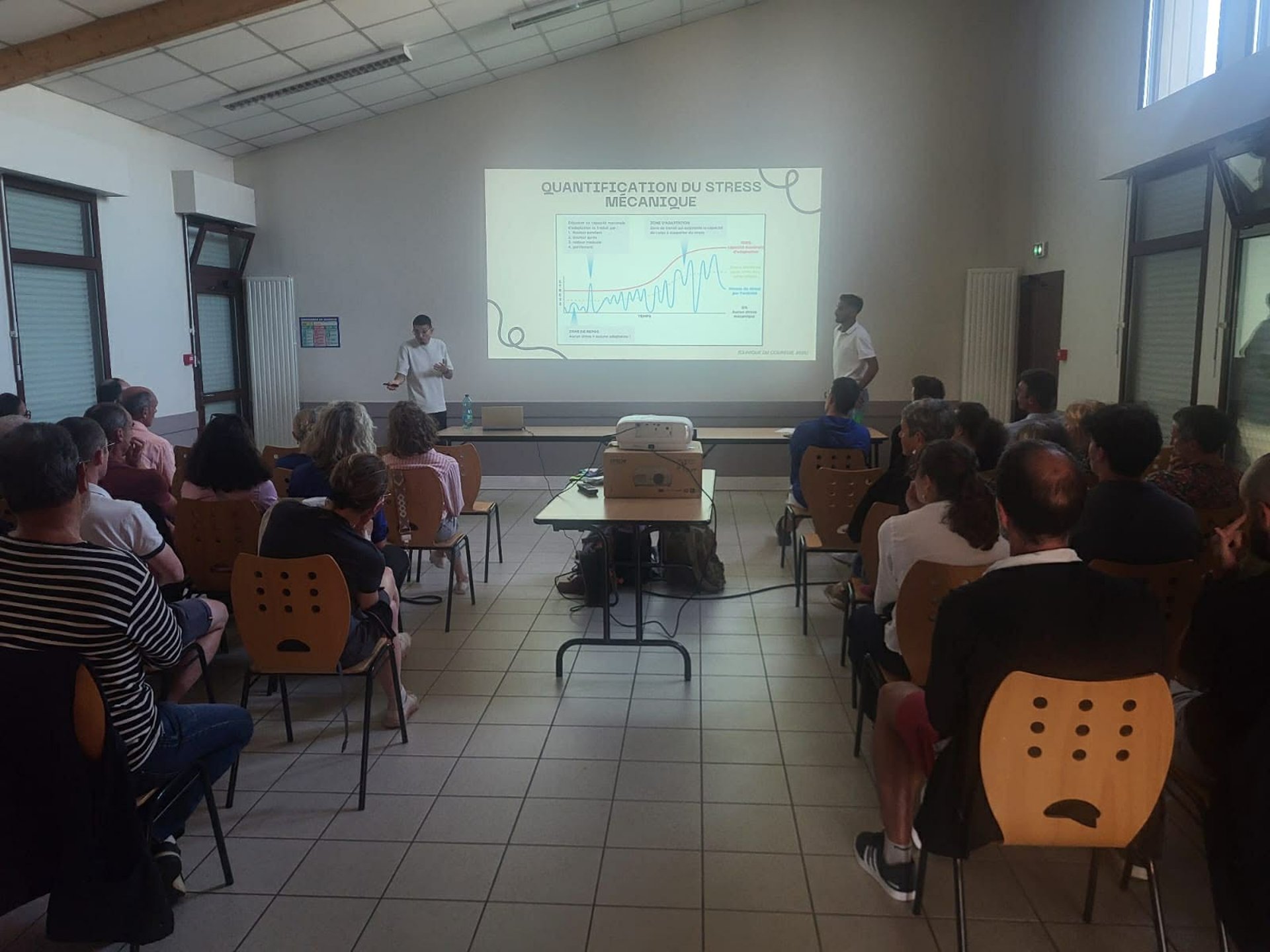 Melvin et Valentin sont intervenus dans le cadre d’une réunion dédiée à la prévention des blessures pour les coureurs à pied et les marcheurs. Leur intervention s’est déroulée dans la bonne humeur. Ils sont professionnels, à l’écoute et ont su s’adapter aux contraintes que nous leur avions imposées.